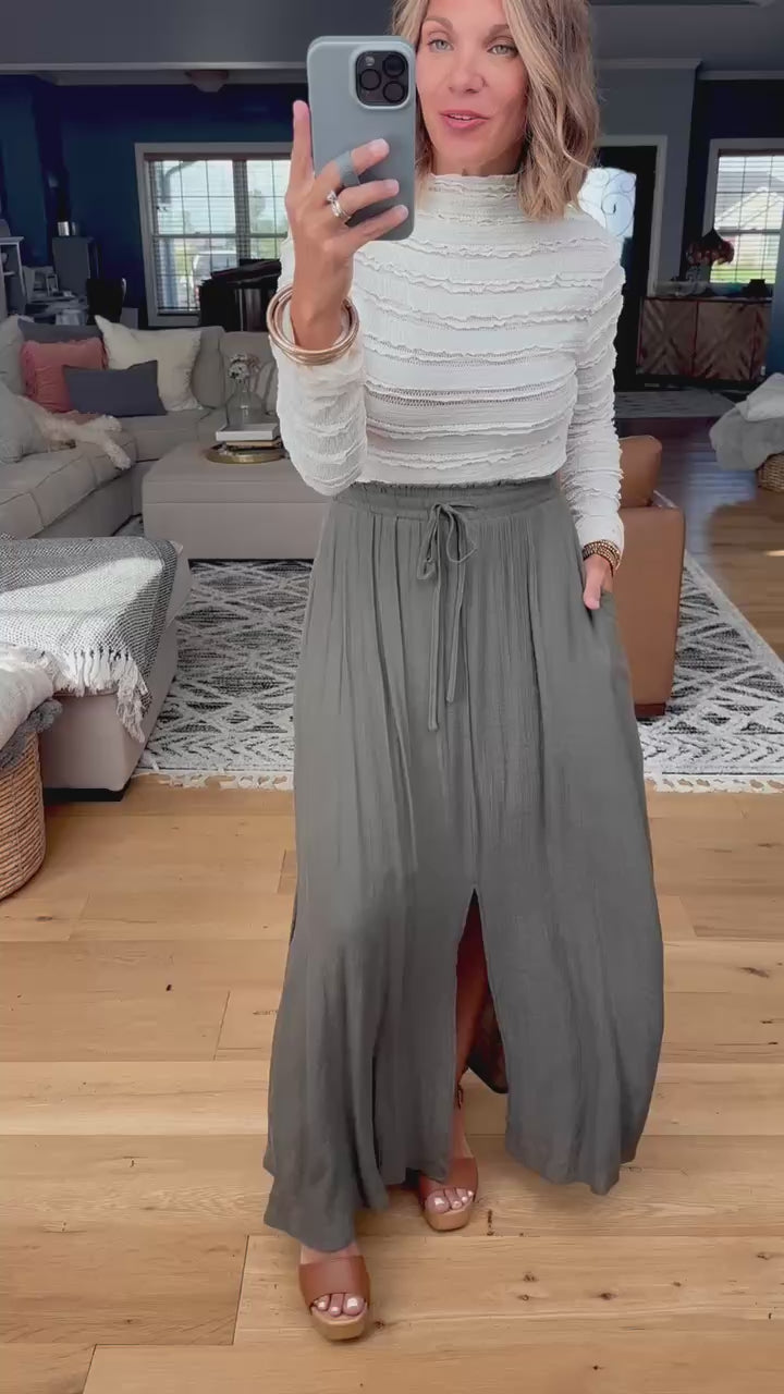 This olive maxi skirt is designed with a flattering tie-waist detail and a subtle front slit for easy movement. With its flowy drape, it transitions effortlessly from casual days to chic nights out.