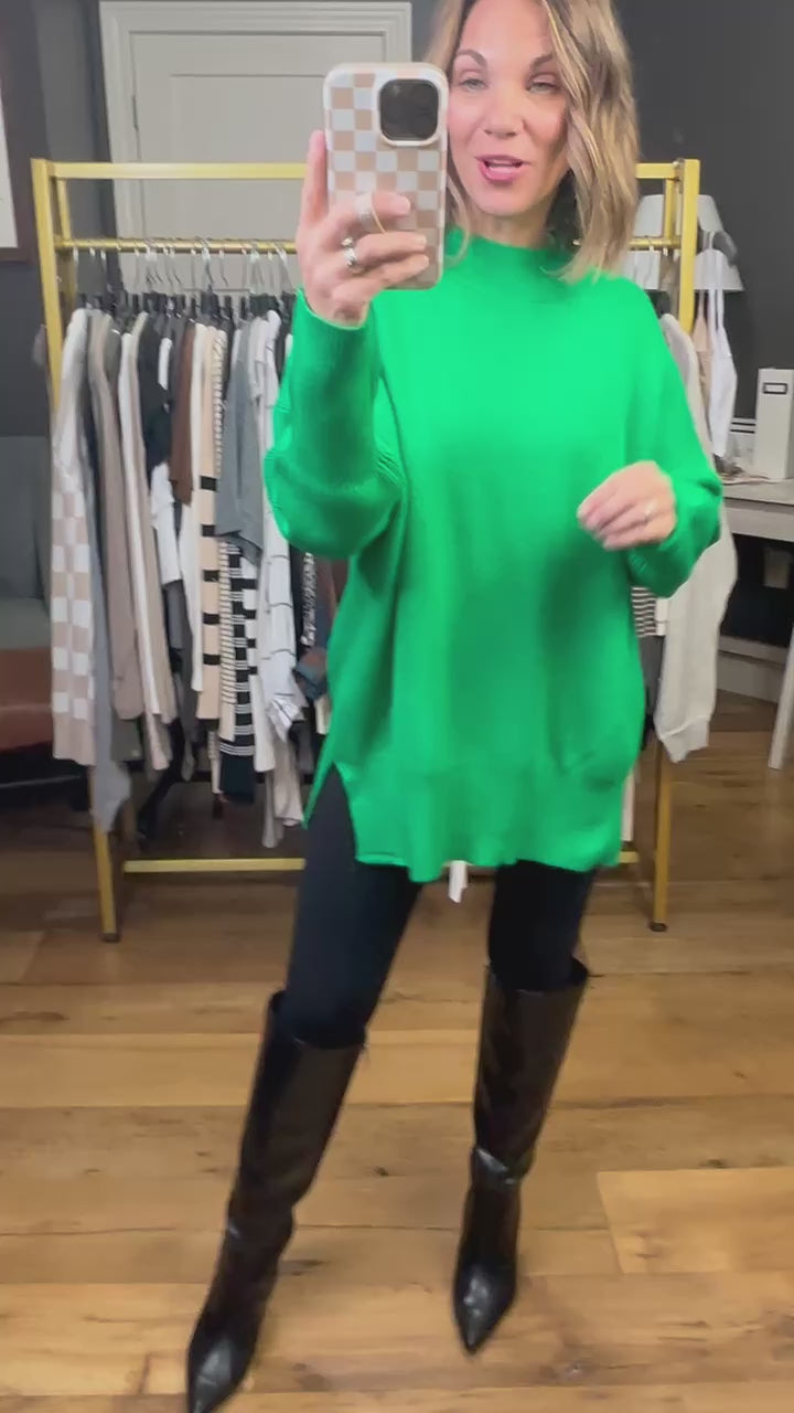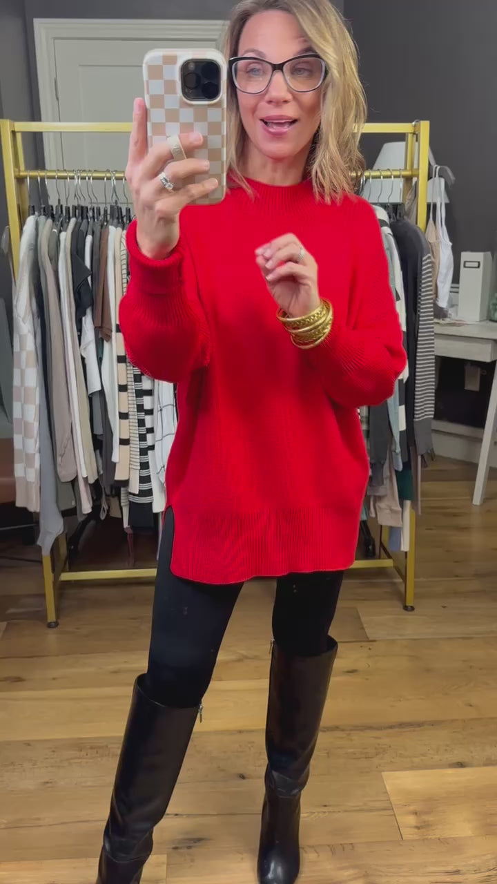 The perfect comfy cozy sweater in a beautiful red or green color! This is a relaxed style sweater with a crew neck, standard length and side slits along the bottom hem. This can be worn casually with leggings or dressed up with denim!