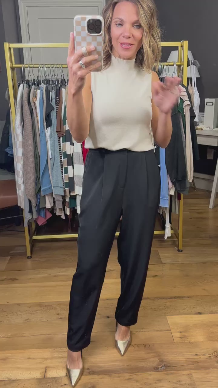 We have found the perfect dress pant trouser! These have pleat detailing, a button and zip closure, and pockets. They have the nice flowy pant style with elastic in the back of the waistband to also give them a more comfortable high rise fit. These are a true to size pant that can be style for tons of looks!