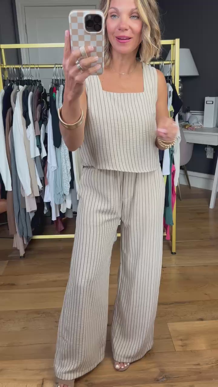 Check out this matching set with a striped print, featuring a true-to-size crop tank with square neckline and a flowy wide leg pant with convenient pockets. Effortlessly stylish and versatile, this set has you covered for any occasion. Don't miss out on this Light Khaki combo!