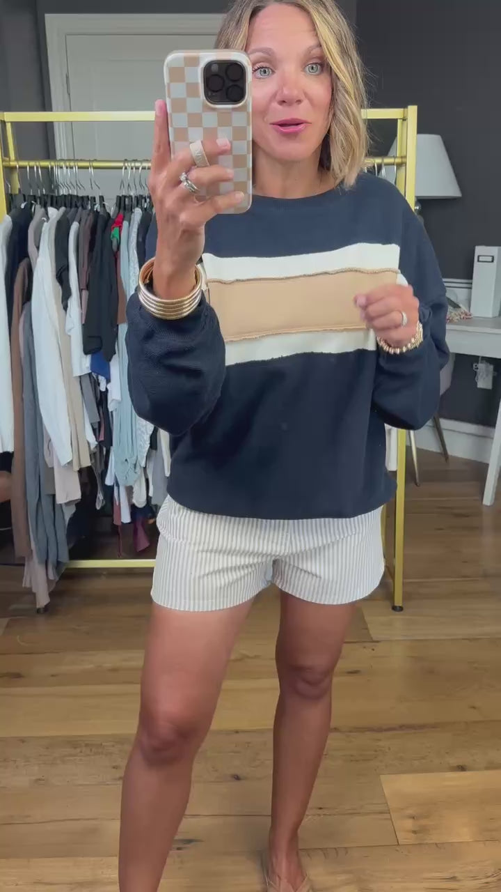 This classic style pullover is in a pretty navy, white and mocha! It runs true to size and is a casual style that pairs well with shorts and sneakers or sandals for the transitioning seasons! Exposed, raw seams, gives this sweatshirt a vintage, lived-in vibe.