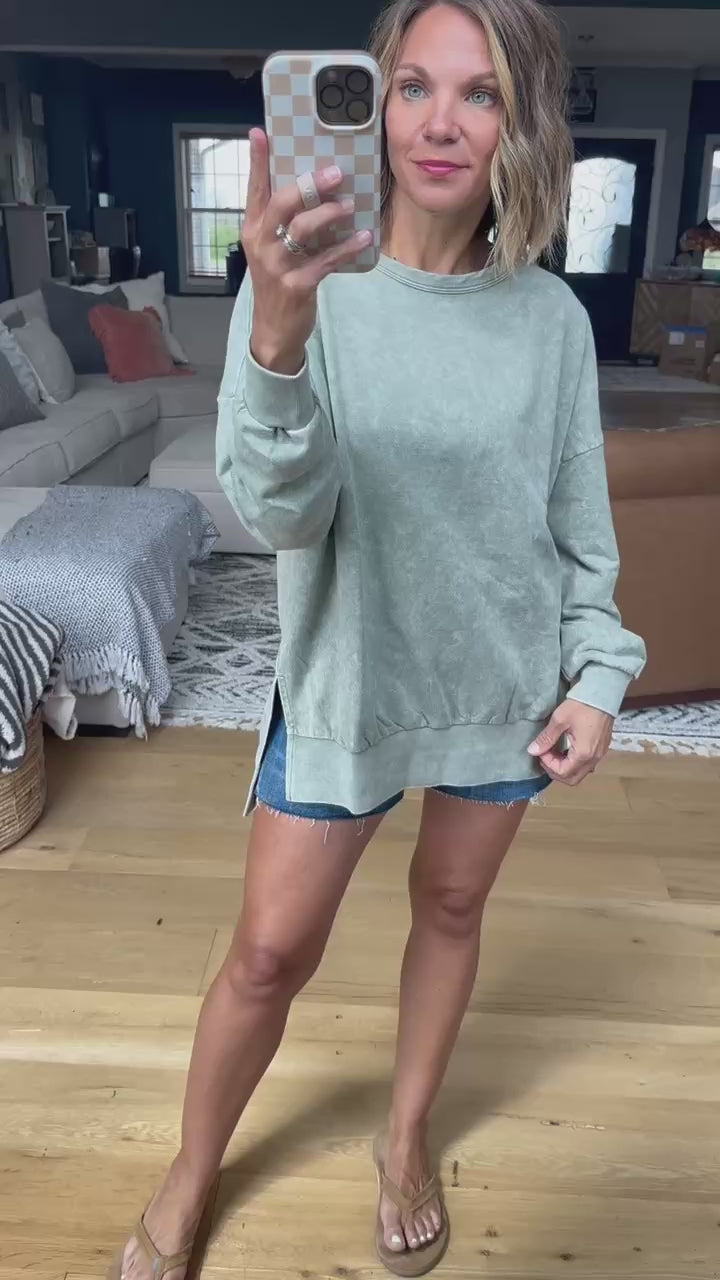 We grabbed this pullover in two cute vintage wash colors! This fits true to size with a nice longer length and side slits. Throw this on with shorts or leggings for a casual outfit!