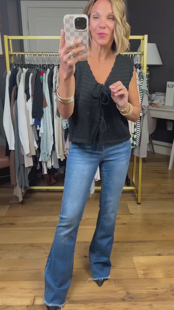 We are loving the sweater vest style, and the tie detailing down the front is right on trend! This is a staple black colored knit sweater vest and fits true to size. Pair this with a standard bra or tee underneath!