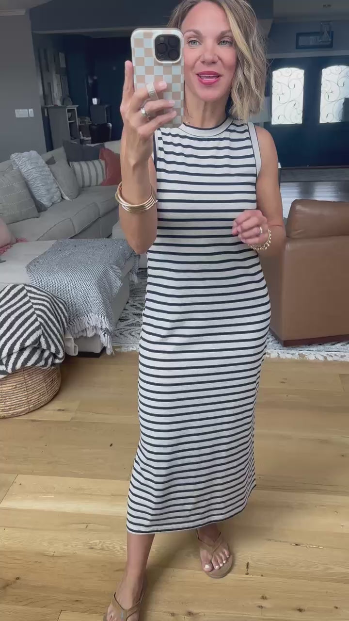 Meet your new favorite everyday dress! This comes in a black and white striped print. It fits true to size and is a midi length with side slit. It is bra friendly and looks cute on its own or with a cardigan or denim jacket thrown over top!
