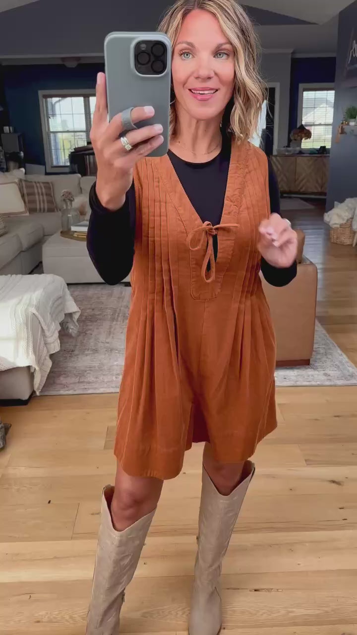 Perfect for transitioning seasons, this textured romper pairs rich tones with a flattering, laid-back silhouette. Featuring pin-tuck detailing, tie-front accents, and handy pockets, it’s an easy piece to dress up or down. Available in earthy rust and olive, it’s a versatile favorite you’ll reach for again and again.