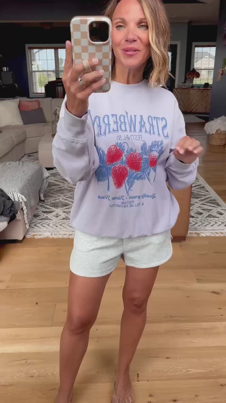 These fun fruit prints and graphics have been trendy all season long! This pullover features a cute strawberry graphic on the front and a true to size fit. This is a relaxed option to pair with shorts or leggings!