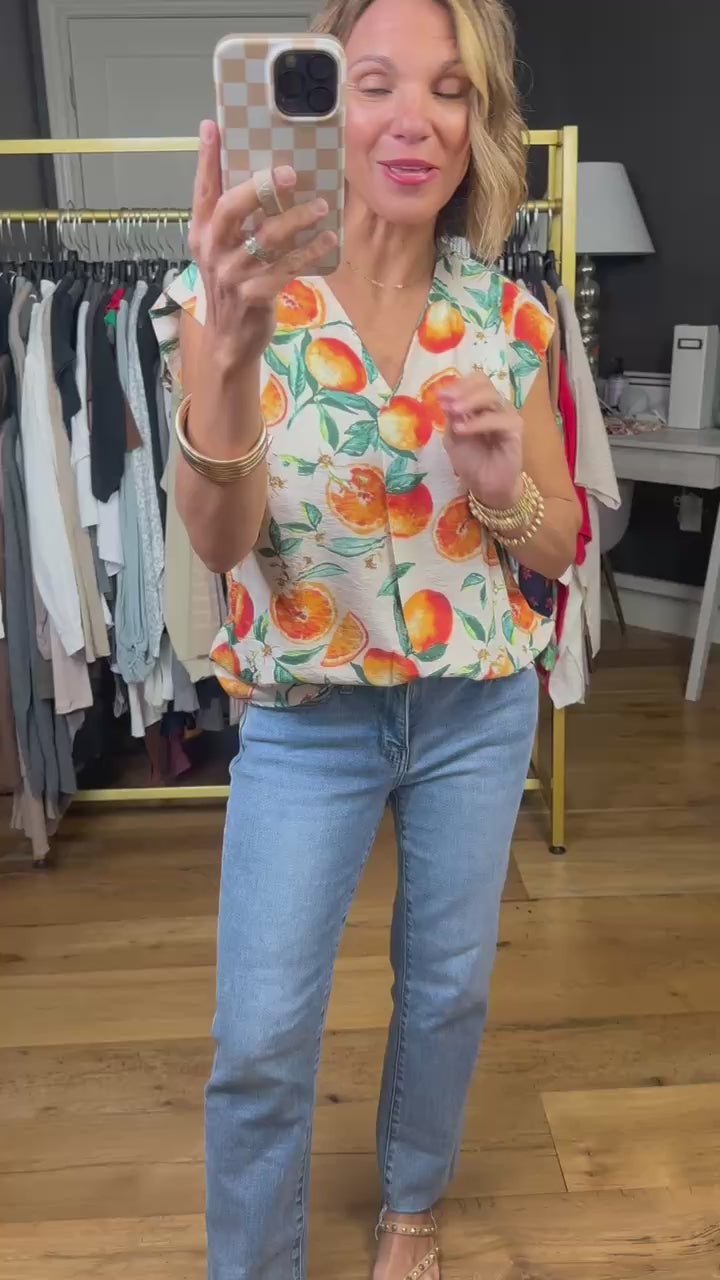 Get ready to add a pop of citrus flavor to your wardrobe with our Sun-Kissed Citrus V-Neck Top! True to size and featuring a playful orange print, this top will brighten up any outfit. With a flattering v-neck and stylish cap sleeves, you'll be sure to make a statement wherever you go.