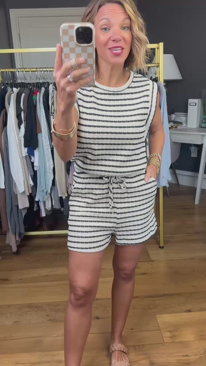 We love a little romper for the summer, and this crochet style design is perfect! This fits true to size with a tie at the waist to accentuate the waistline. It has pockets and is sleeveless but still bra friendly. Throw on some jewelry and sandals for a cute and casual look!
