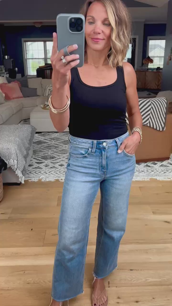 Such a good utility tank for your wardrobe! This comes in black and white, fits true to size and has a square neckline. It is a great fitted option to pair with denim, trousers or skirts for a nice tucked in look!