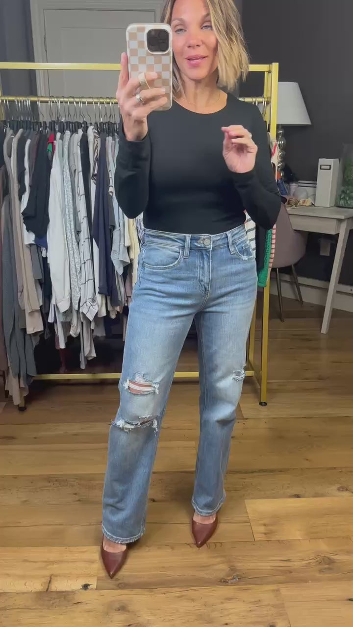 If you love a distressed denim, these are for you! These are a super cute dad jean style, meaning more relaxed design, with a high rise waistband. These fit true to size and are a comfortable denim style for pairing with lots of looks any time this year!