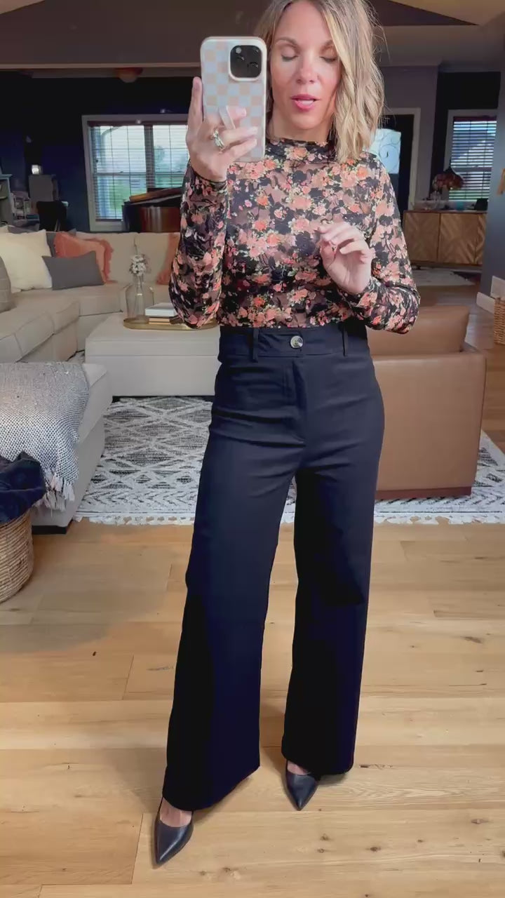These are a chic pair of black straight leg pants, perfect for any wardrobe! These fit true to size with a high rise waistband and slimming look. These are great to dress up or down!