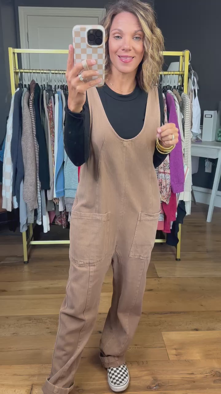 This jumpsuit has been a hit so we brought in this light wash version! This is a denim jumpsuit, but isn't as heavy as your traditional denim. It fits true to size and is a relaxed option with adjustable straps in the back. It has pockets and we love it paired over a tank, tee, bodysuit or brami!