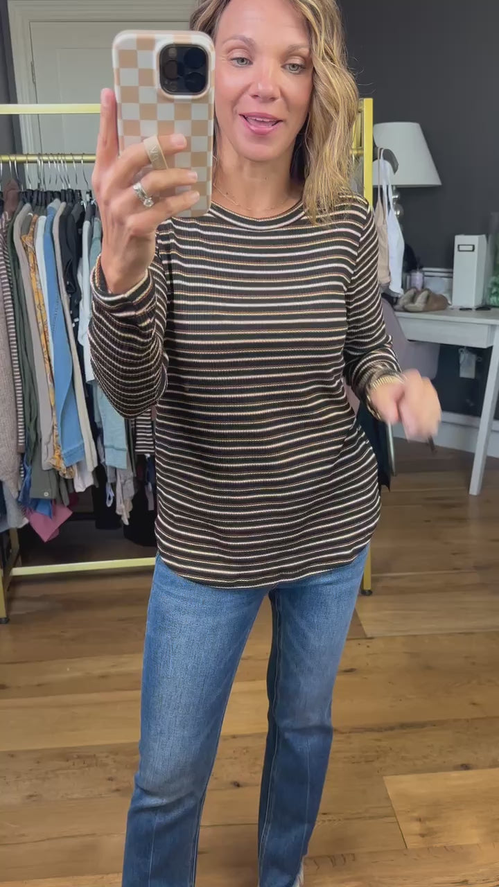 You can never go wrong with a striped tee! This one is a long sleeve, crew neck style and it is standard length. This fits true to size and is easy for throwing on with denim or tucking with trousers!