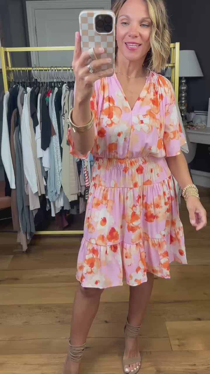 Such a beautiful spring and summer floral dress! This has a v-neck with 1/2 length sleeves and flowy skirt. This has elastic at the waistline to accentuate the figure as well. Pair with heels, sandals or even a simple white sneaker depending on the day!
