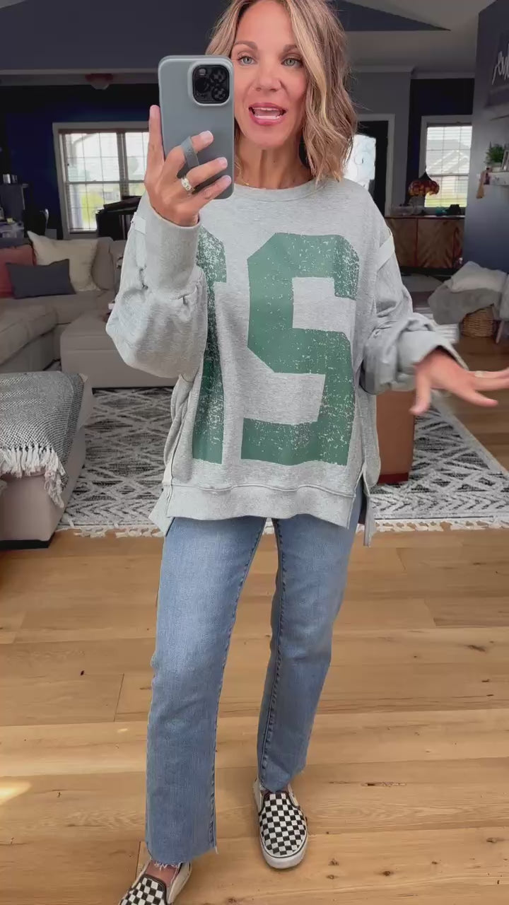 Such a cute pullover option! This relaxed style has a fun "worn in" look with "98" on the front. It fits true to size with a hi-lo bottom hem and side slits along the bottom hem. Pair with denim or leggings!
