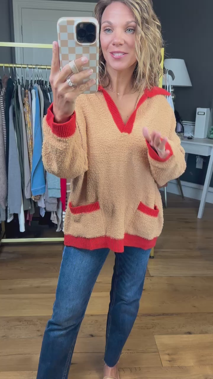 This is a fun and cute style that we have in two color options! This has a relaxed, true to size fit and v-neck. This top has a collar and pocket detailing as well. Pair this with leggings or denim!