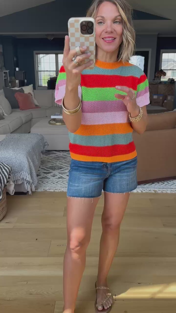 How darn cute is this striped top! This fits true to size with a crew neck, standard length and short sleeves. This is a great option to throw on with denim shorts or jeans! Steph typically wears a size small but she is wearing an XS in this top!