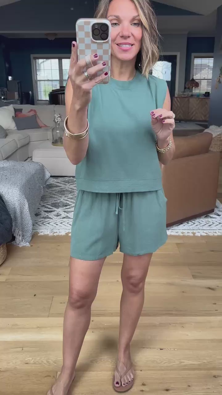 A cute matching set in a great teal green color! This comes as a set with a tank and shorts, both fitting true to size. This is a comfortable, relaxed style that pairs well together or separately!