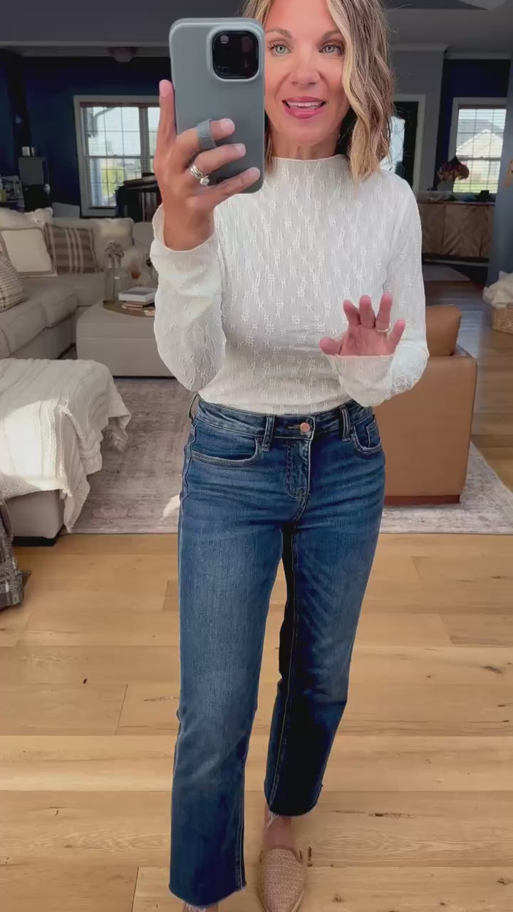 Soft and graceful, this ivory long-sleeve top is adorned with delicate stitched detailing that brings a touch of timeless charm. The high neckline and subtle texture create a romantic silhouette, perfect for pairing with flowing skirts or classic denim for an effortlessly feminine look.