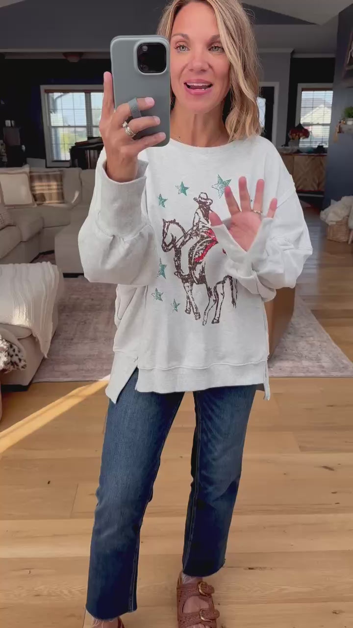 Add a touch of western charm to your fall lineup with this heather grey crewneck pullover. Designed with a hi-low hemline and subtle side slit, it pairs casual comfort with an easygoing edge. The bold cowboy-inspired graphic makes it a standout piece for laid-back days, layered looks, and all your autumn adventures.
