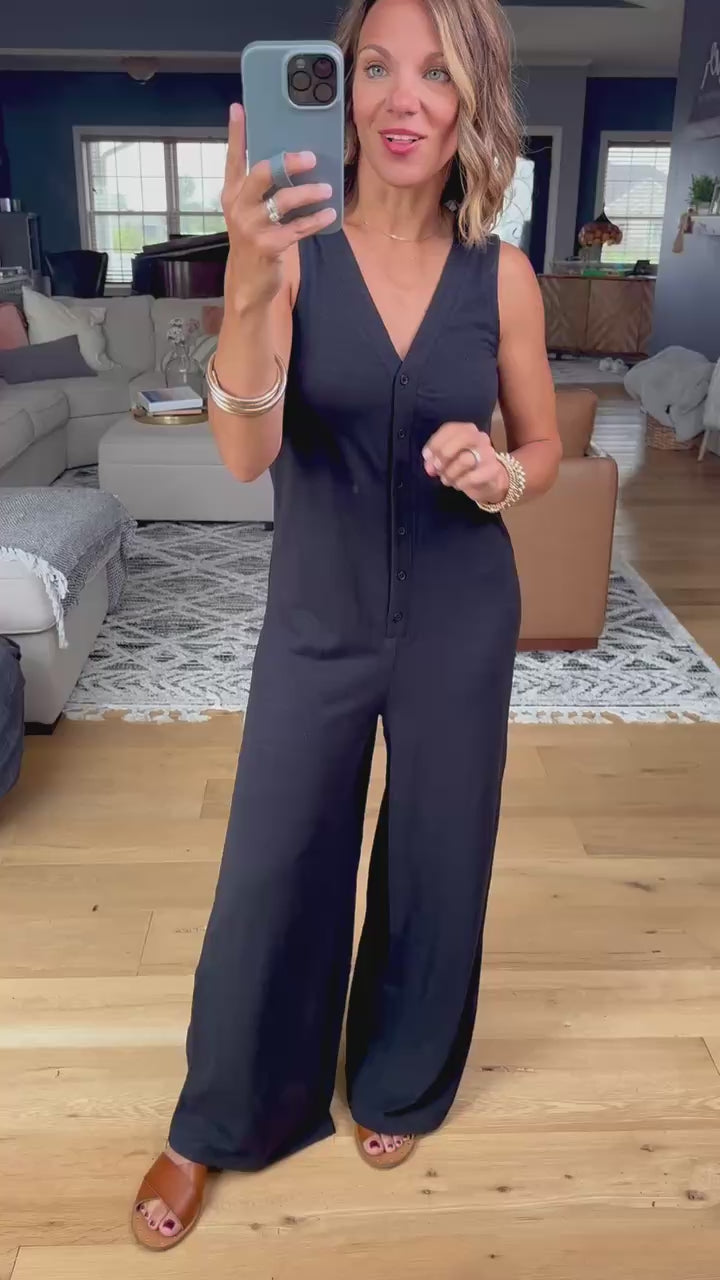A comfy cute jumpsuit style! This fits true to size with a v-neck, sleeveless cut and buttons down the front. This jumpsuit features flowy wide legs and can be dressed up or down. You can also layer with a cardigan or denim jacket too as we head towards fall!