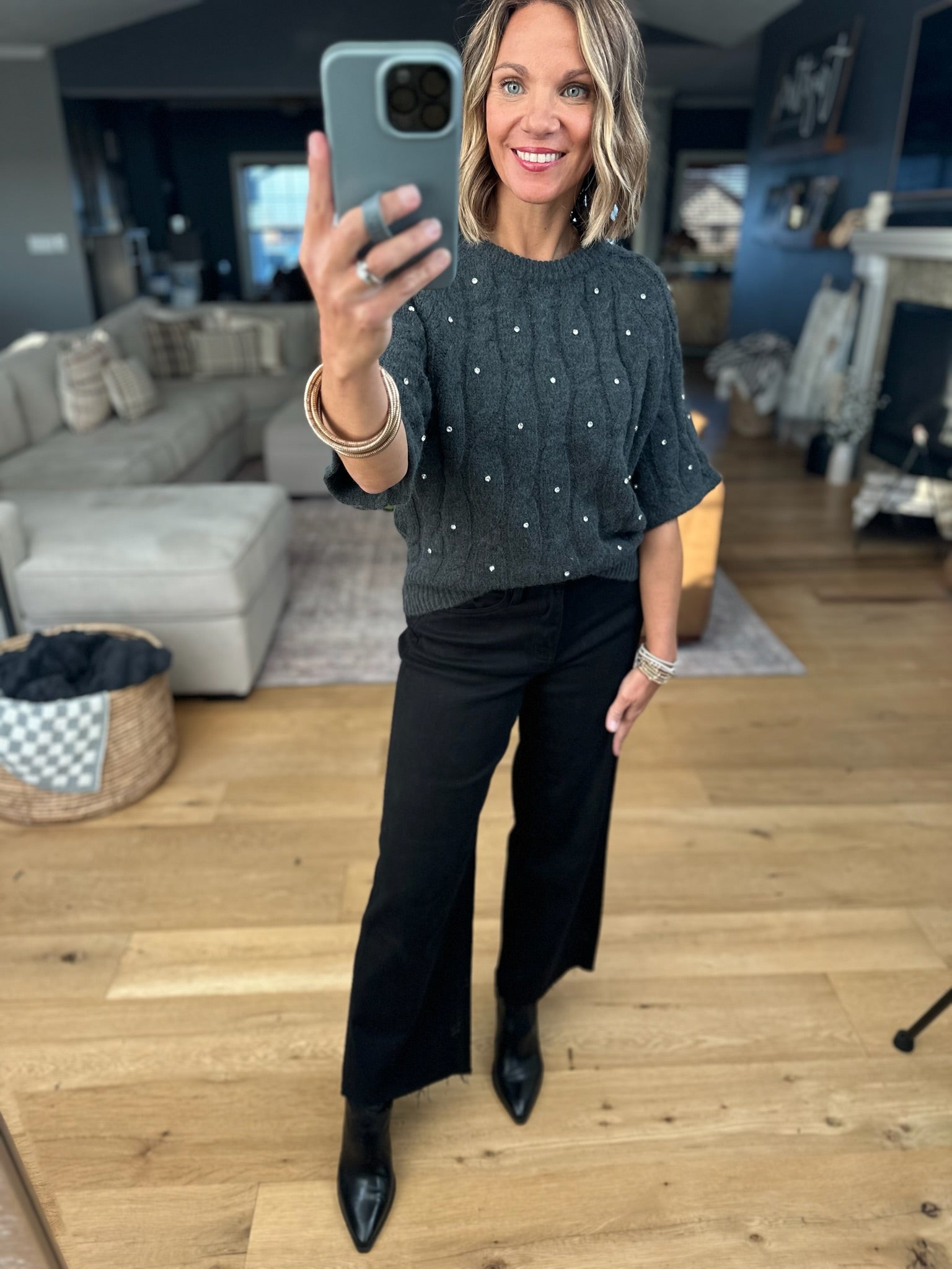 Meet your new perfect top for adding a little sparkle to your look! This knit blouse fits true to size with a 1/2 length sleeve and a nice length. Pair this with denim or trousers for a super cute and easy look! No need to accessorize, the jewel details speak for themselves!