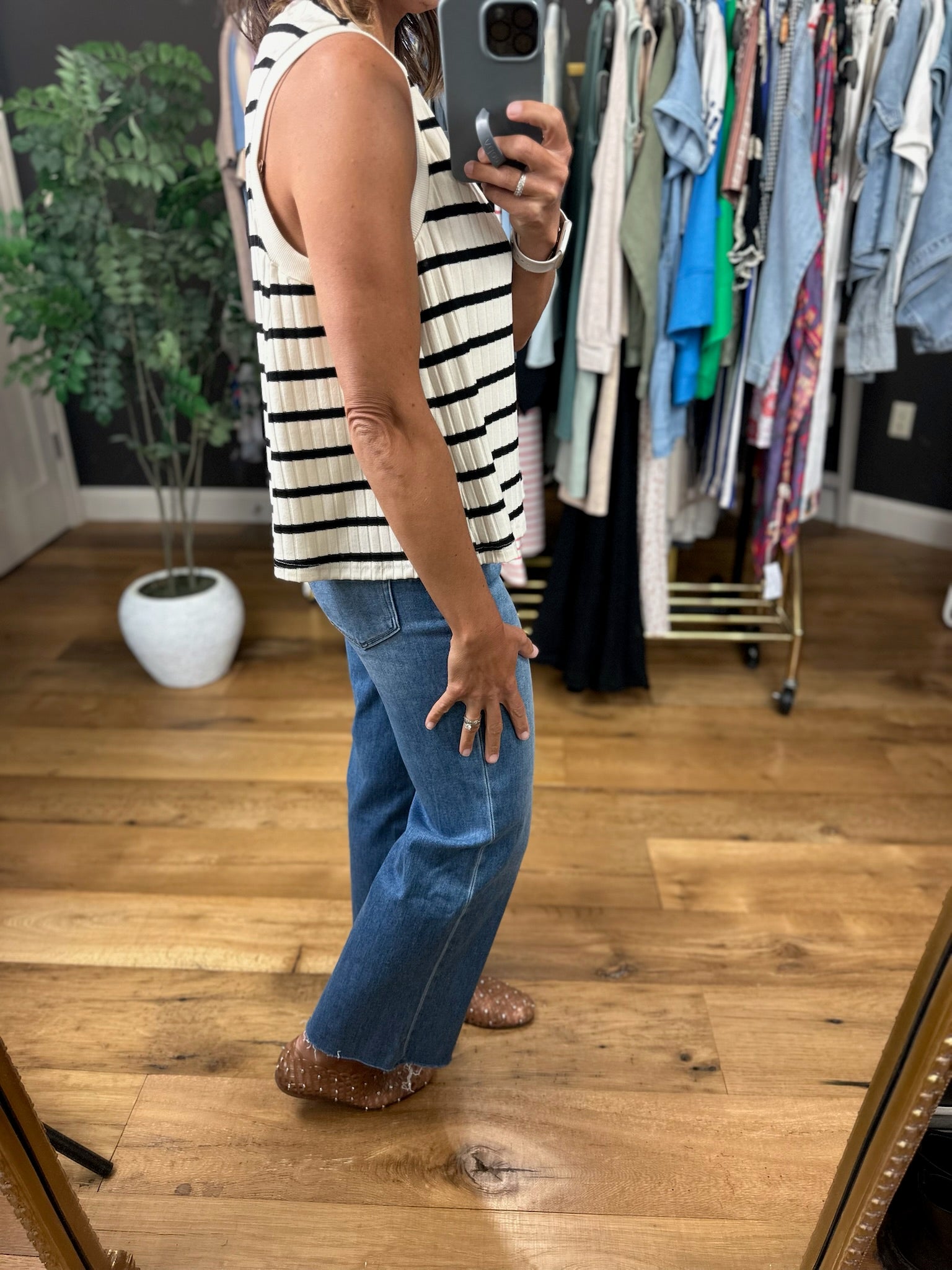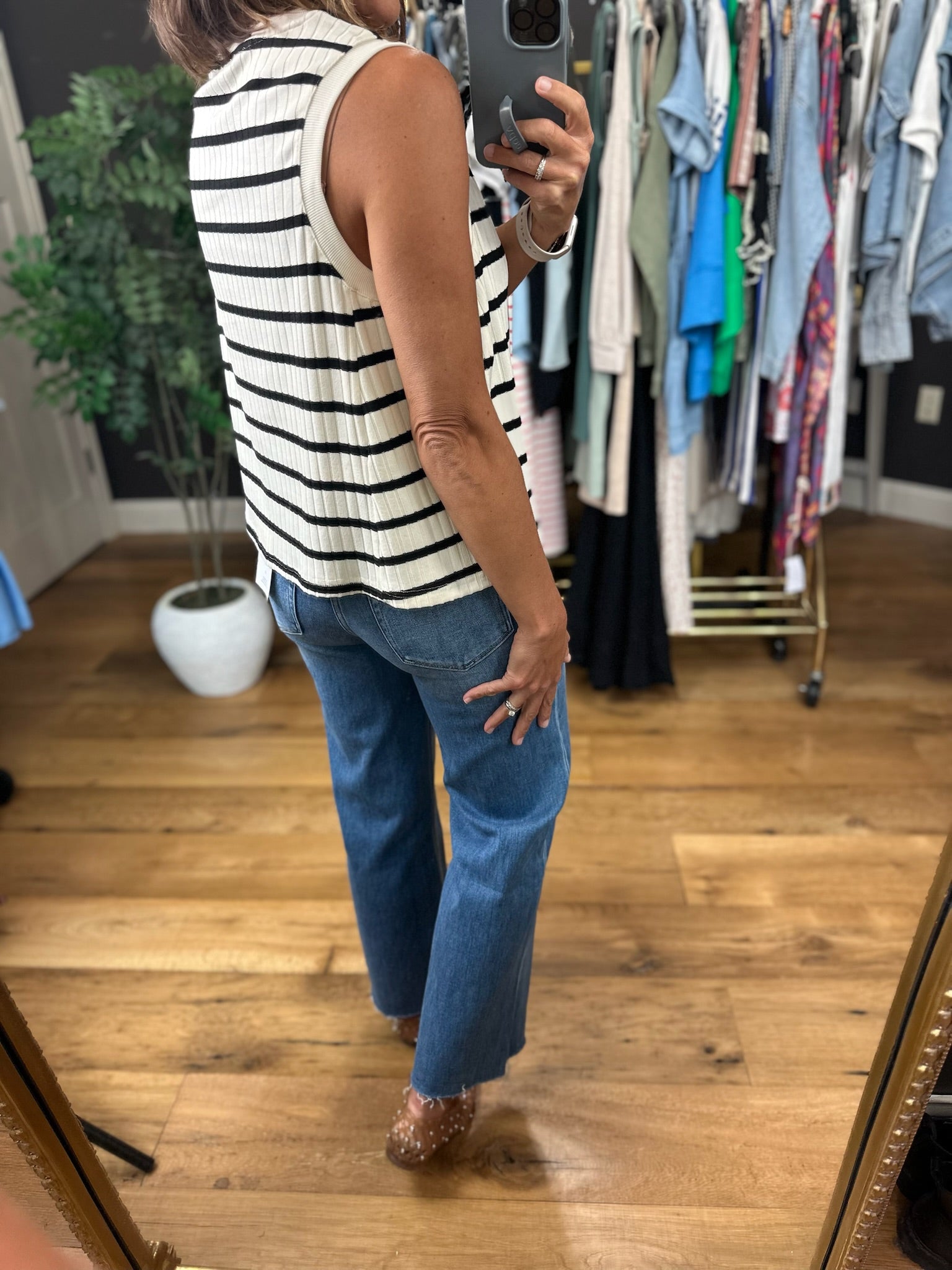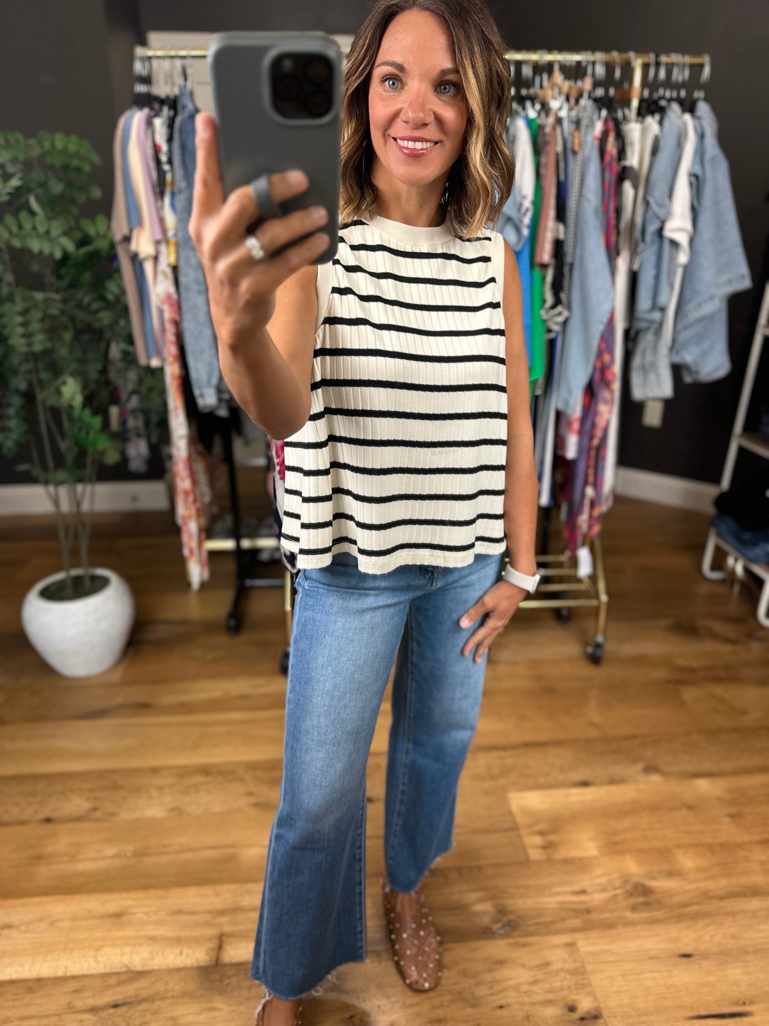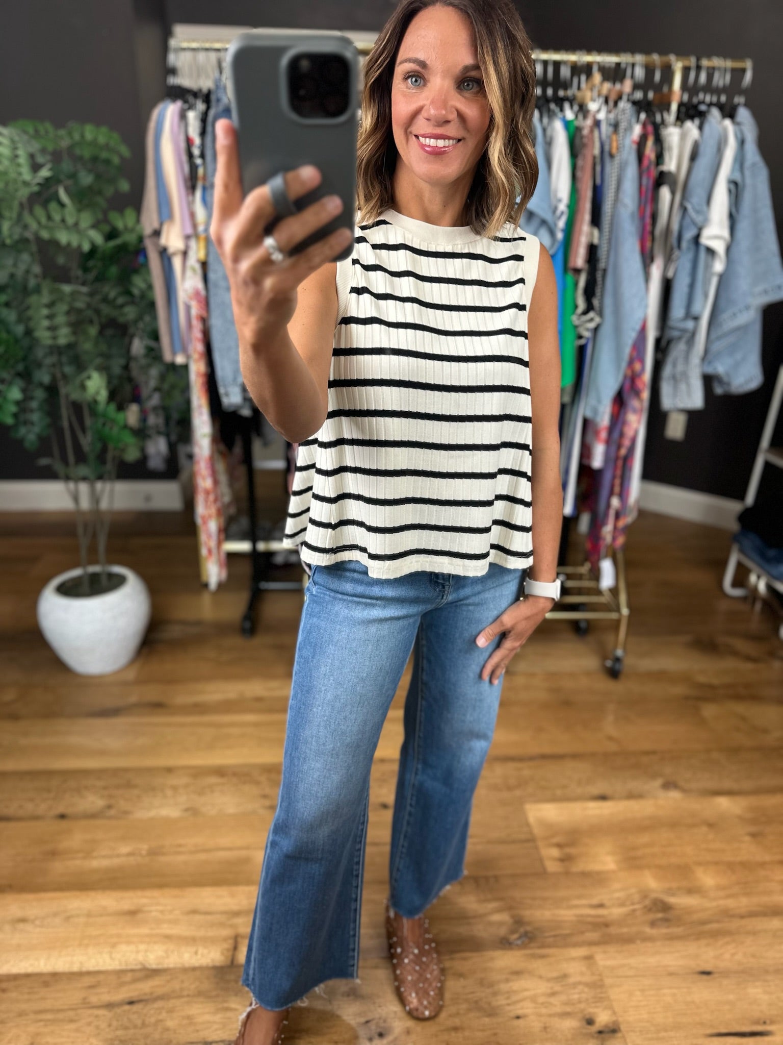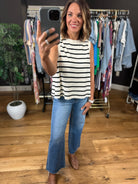 Grab this cream and black striped top for dressing up or down! This is a sleeveless style, but is still bra friendly, and it fits true to size. This is a flowy option, but you can tuck or add a front tuck for some extra structure.