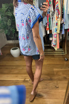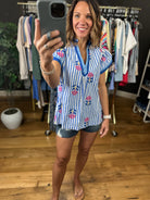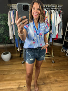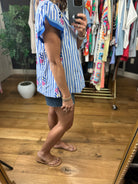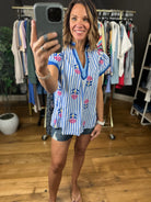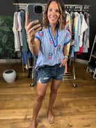 Meet the perfect spring and summer blouse! This is a pretty blue and white stripes blouse with blue trim detailing and darling floral embroidery. It fits lightly oversized due to the cotton fabric making it flowy, so if between sizes then you can potentially size down. This is a great option to pair with denim, linen or dress pants!