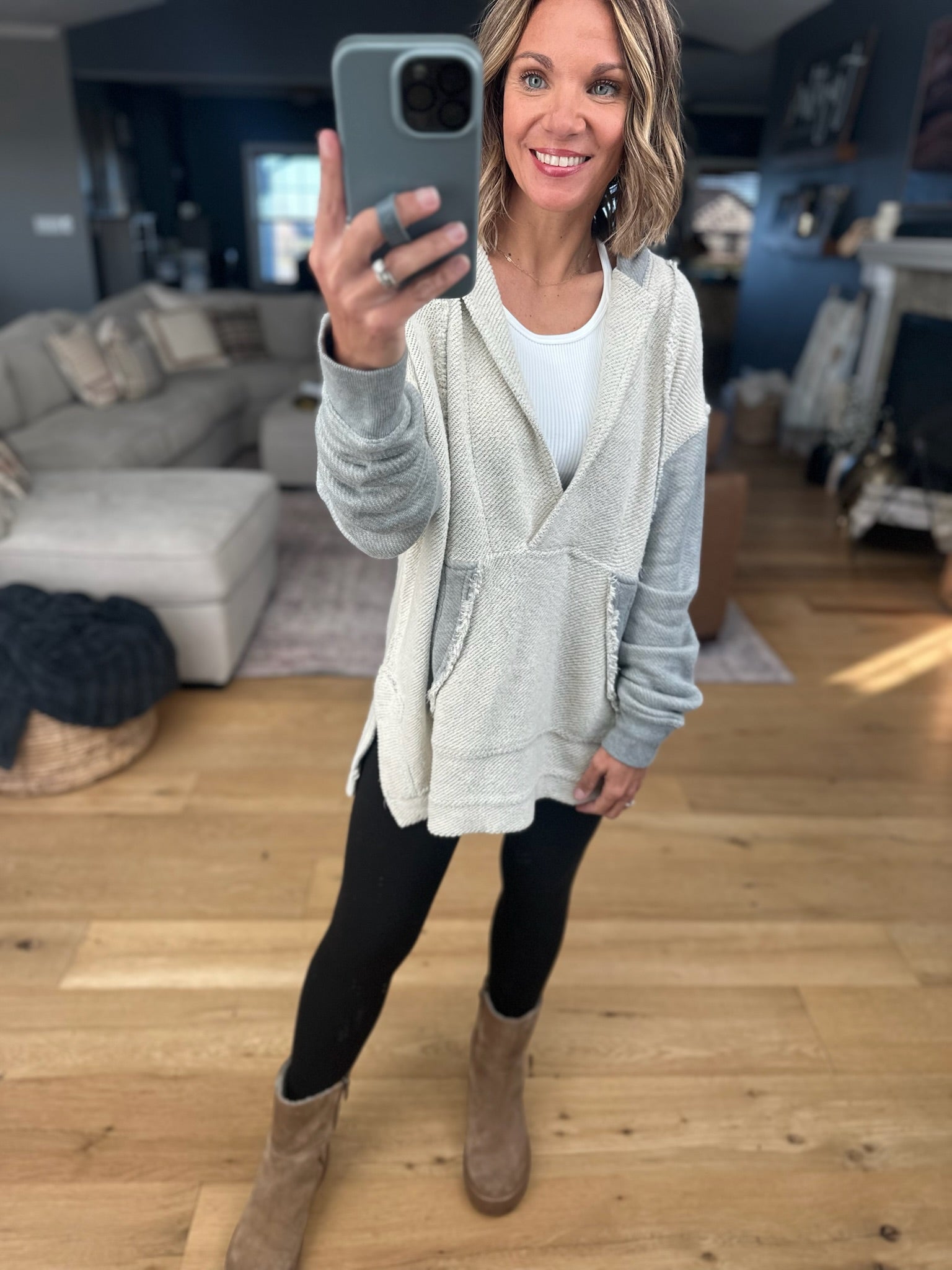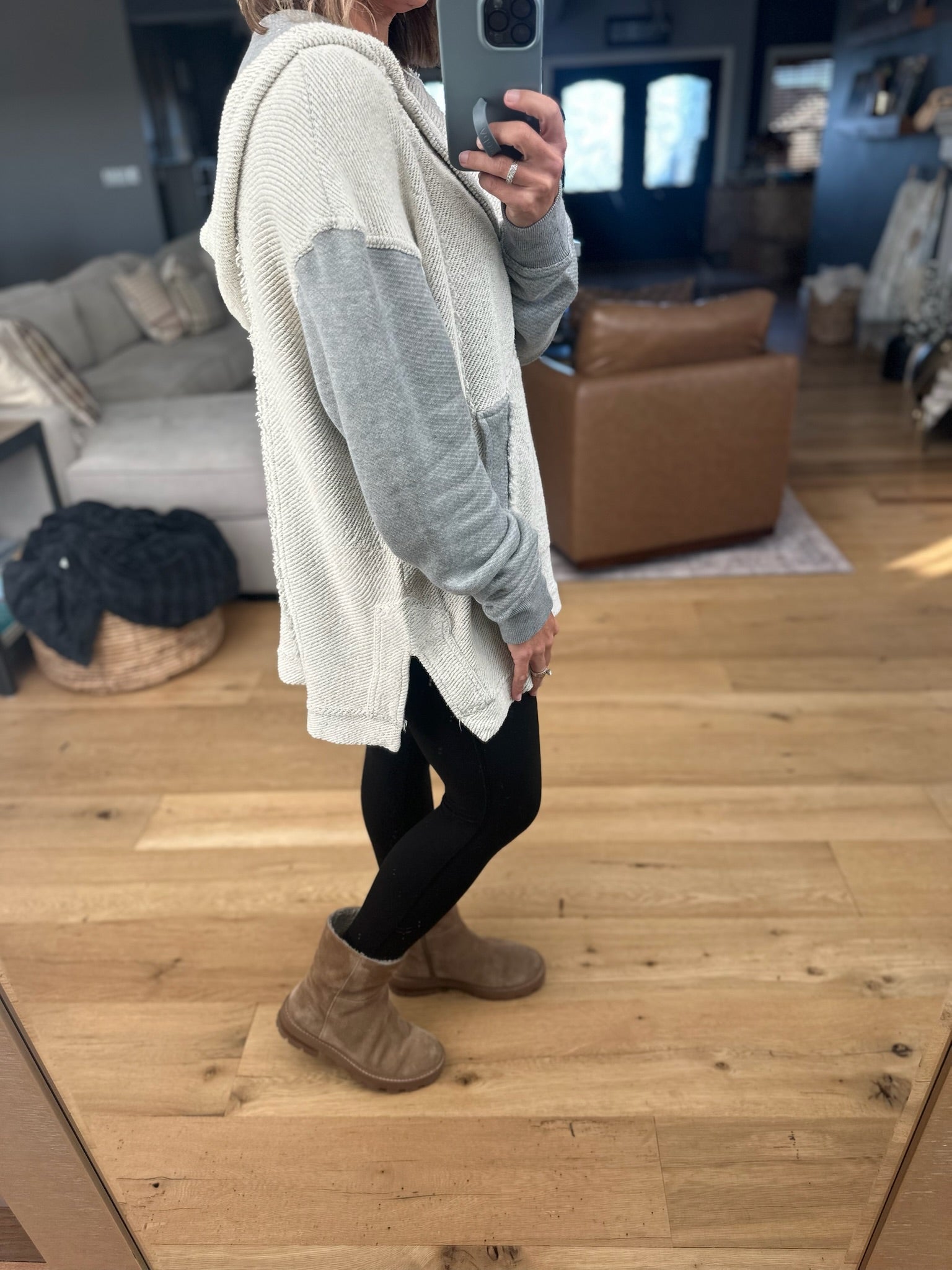 This is a great casual pullover for the chilly season! This has an "inside out" design with a pocket, deep v-neck and hood. This fits true to size, but lightly relaxed, plus it is a longer length that makes it great for pairing with leggings!