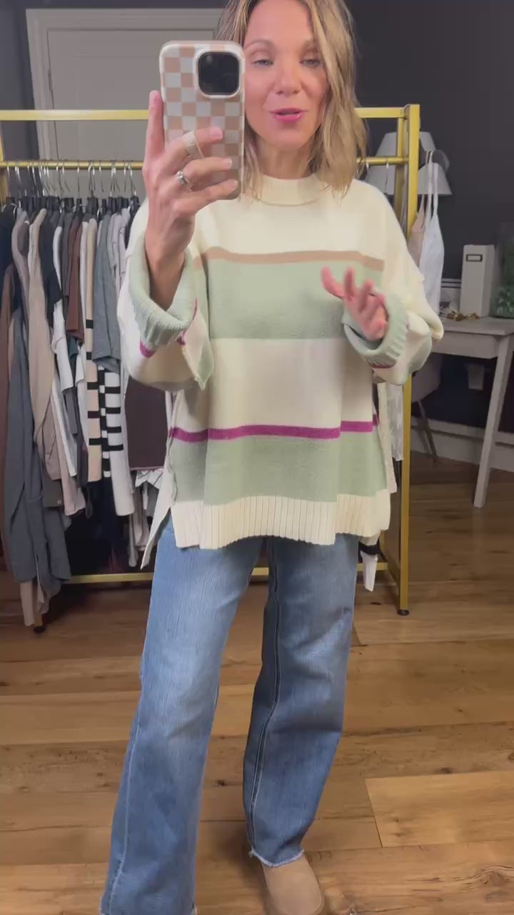 This is available in two color options, this sweater boasts a playful stripe print and cuffed bell sleeves. It fits true-to-size with a longer length will flatter your figure and side slits along the bottom hem. Don't hesitate to add this unique piece to your wardrobe!