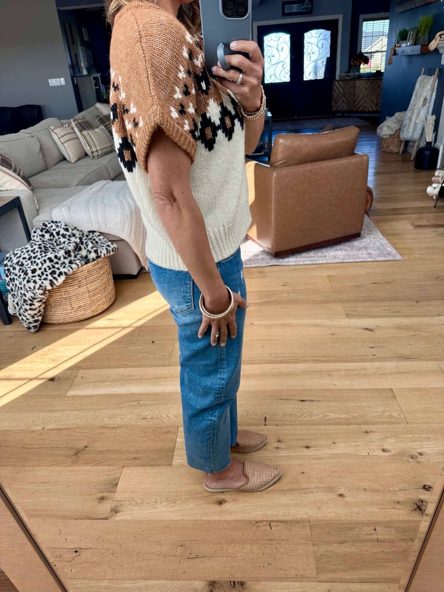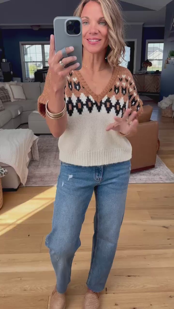 This knit v-neck top is a cozy-chic piece with standout style. Featuring a bold patterned design across the shoulders in warm, earthy tones, it pairs a relaxed fit with soft knit comfort. Perfect for layering or wearing on its own, it’s a versatile pick that brings texture and interest to any outfit.