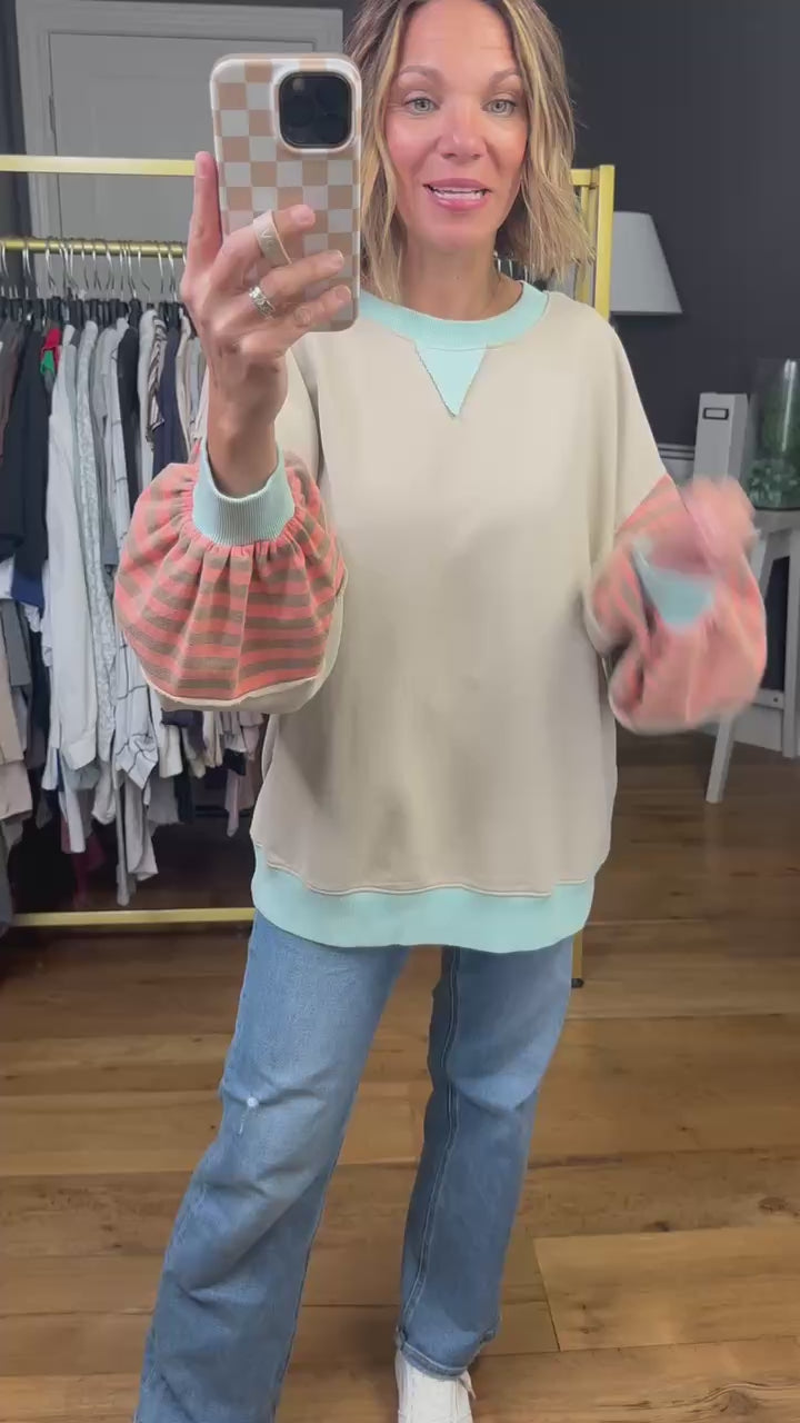 Go on a Great Adventure with this oversized crew! Available in multiple color options, its striped print and colorblocking create a playful contrast. The balloon sleeves add a touch of whimsy, while the flowy style keeps you comfortable and true to size.