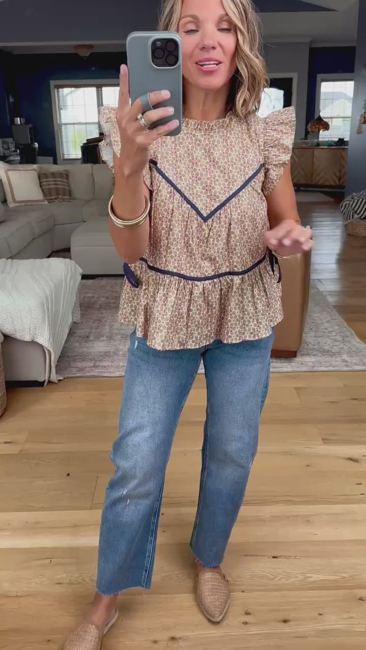 Feminine and fresh, this light floral top features delicate flutter sleeves, a subtle peplum hem, and chic navy ribbon blocking detail. Perfectly lightweight and flattering, it’s an effortless choice for pairing with denim, skirts, or tailored pants.