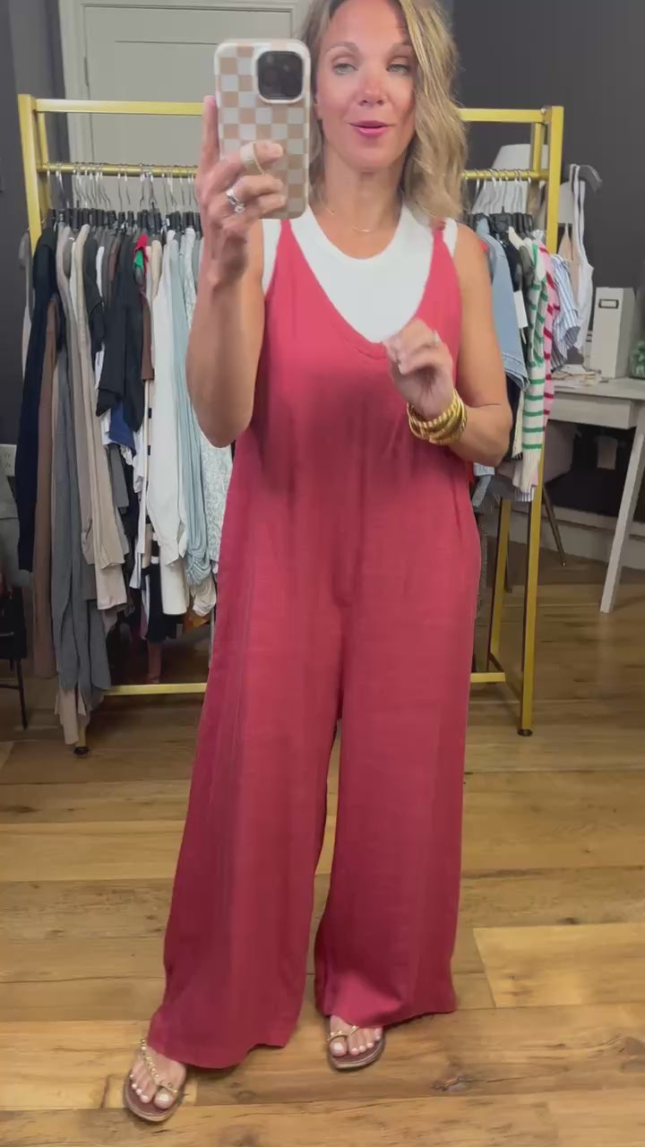We always love a good jumpsuit! This one is a cute crimson color with spaghetti straps and a v-neck. This is a true to size, flowy style with pockets as well. We love the look of this with a tee or tank underneath for a comfortable and easy outfit!