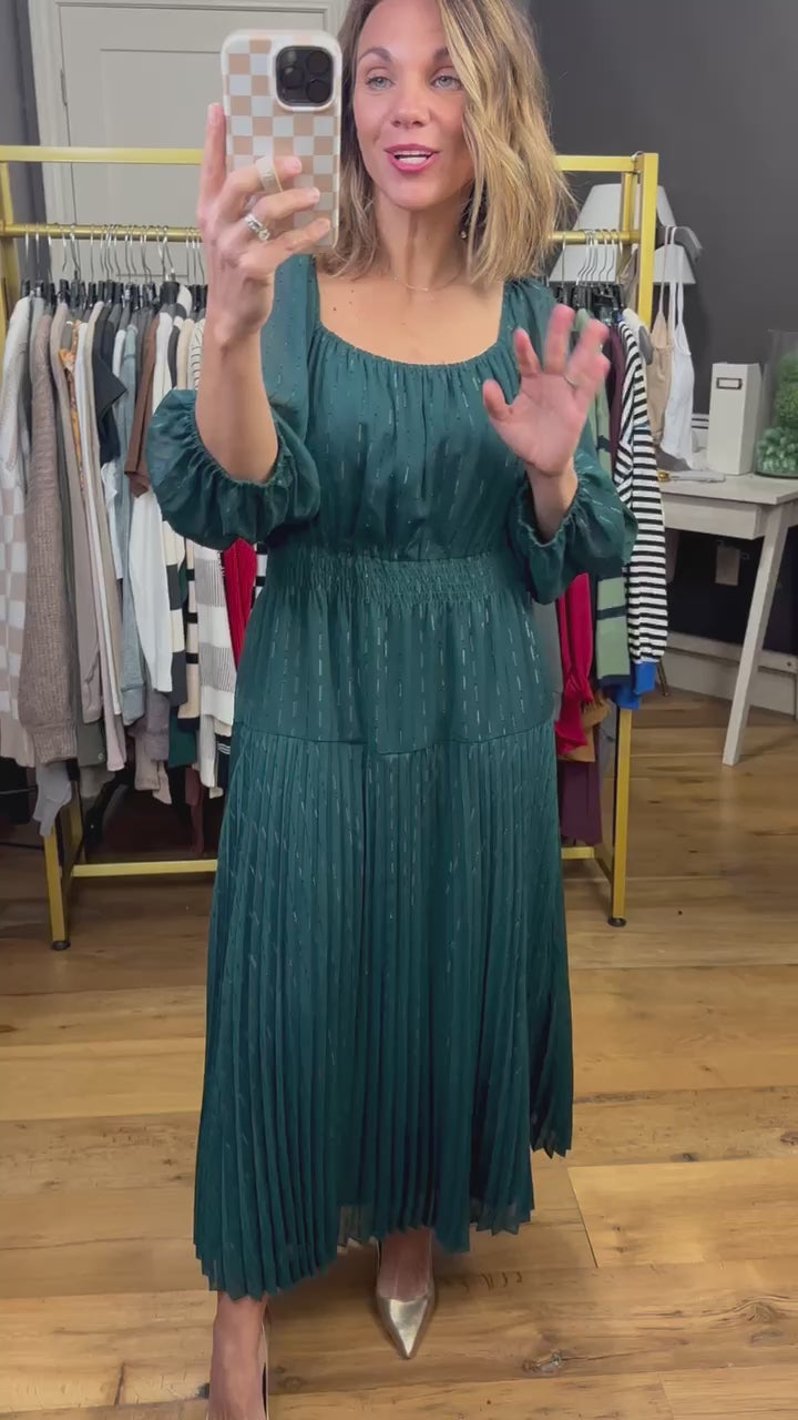 This is a beautiful peacock green dress that will be perfect for the holidays! This fits true to size with a square neckline, balloon sleeves and elastic at the waistline. Pair this with heels or boots and some accessories for a chic look!