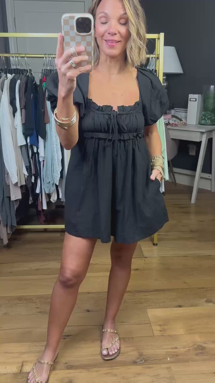 If you love a little black dress, get ready to love this new little black romper! This is a darling romper style that gives a little more functionality than a dress. This has elastic in the sleeves that allow it to be worn on or off shoulder, it has a tie in the back and a tie at the neckline. This fits true to size and even has pockets! Steph is 5'2 wearing a size small for reference. If between sizes, we would recommend sizing up in this style.